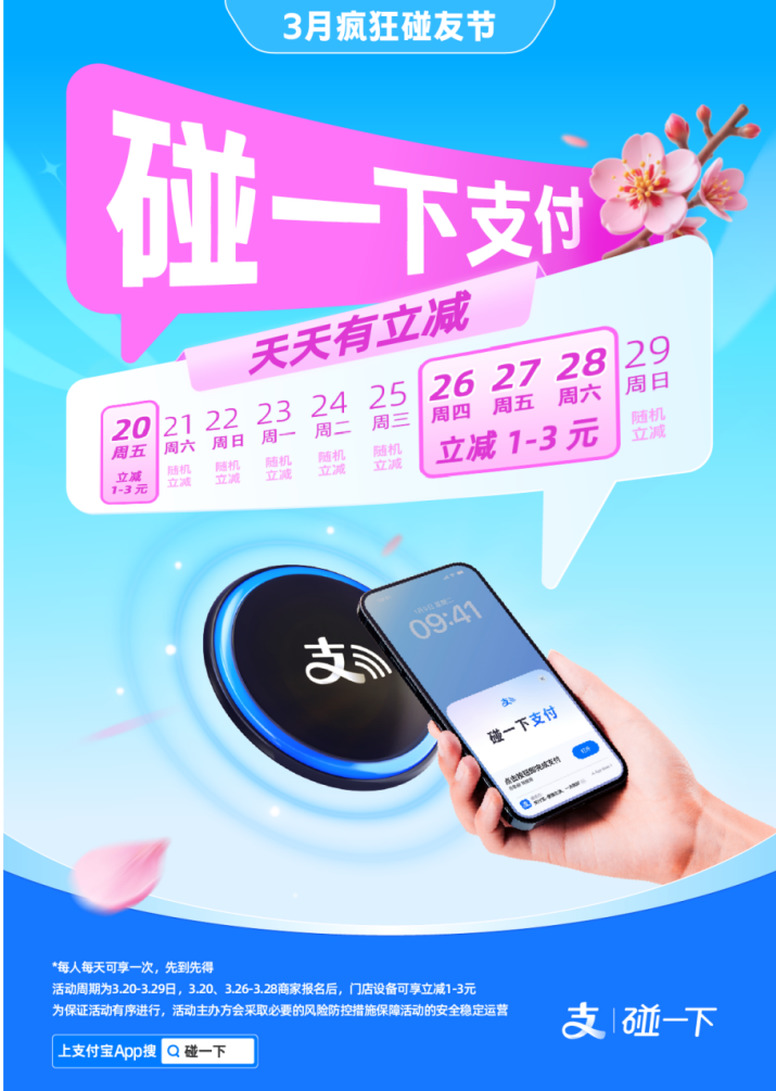 为进一步激发消费市场活力,推动支付便利化与智慧消费场景深度融合,3月20日至29日,支付宝“疯狂碰友节”促消费活动在全国启动。广大消费者只要拿起手机“碰一下”,在线下支付门店就能轻松享受各种消费优惠,助力马年“开门红”。