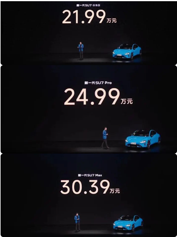 新一代SU7共三个版本:标准版21.99万元、Pro版24.99万元、Max版30.39万元,均比老款贵4000元。