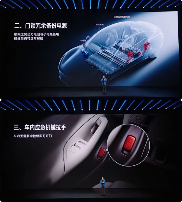 这次雷军直接安排上了三重冗余:车外机械拉手、门锁备份电源、车内应急机械拉手。大电池挂了有小电池,小电池挂了还有备份电源,全挂了还能机械开门。用雷军的话说,“极端情况下四个门都能打开”。你骂他,他真改。