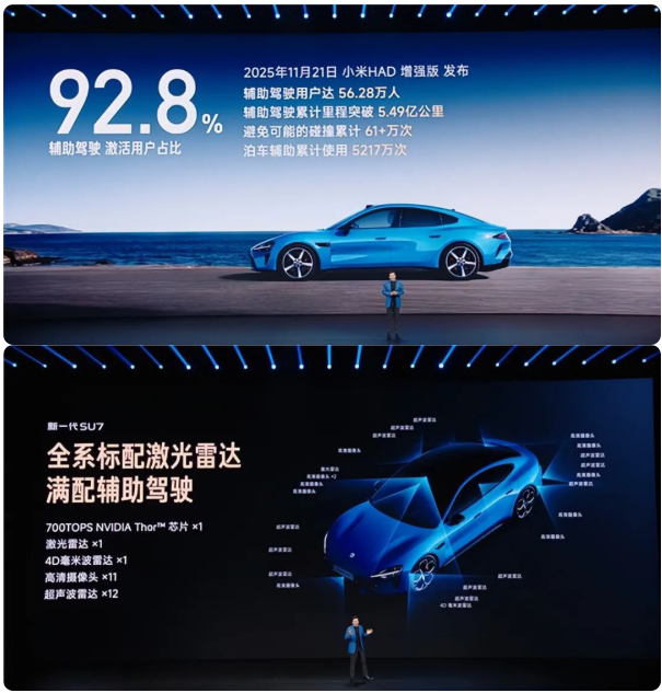 这次升级最狠的是智驾。以前新能源车有个潜规则:想要激光雷达?加钱!想要高阶辅助驾驶?买顶配!但新一代SU7直接把这套玩法掀了——全系标配激光雷达、4D毫米波雷达、700TOPS算力芯片。
