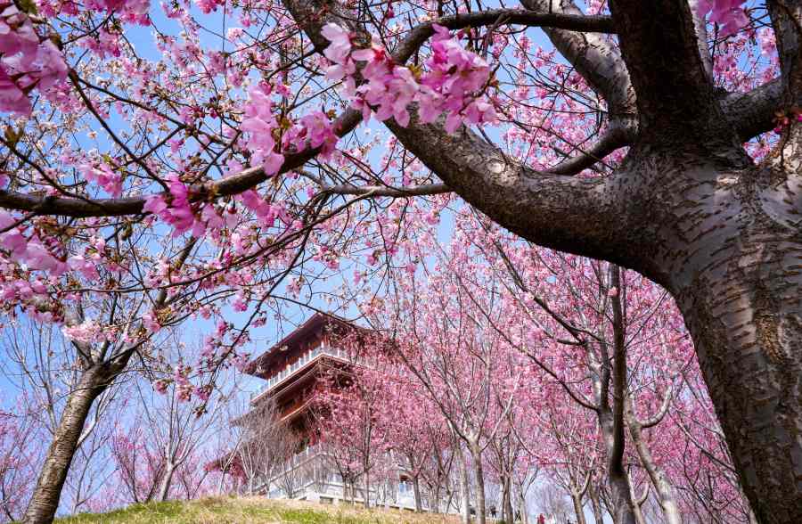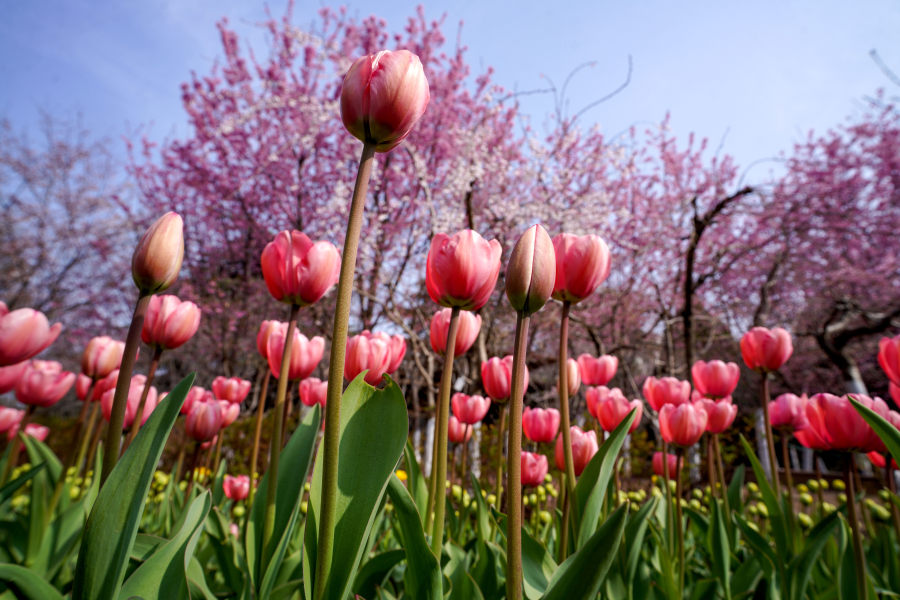 想看灼灼桃花,可以到郑州市动物园——第十二届桃花文化展正在那里举行,一边观赏动物,一边在北部的“桃花街”欣赏桃花,体验感很是独特。若是向往山野间的天然桃林,巩义青龙山是个好去处。三月里,山中的桃花沿着坡势成片开放,走在其中,真有几分桃源之意。不想跑远的话,郑州植物园西门南侧的桃林品种也不少,这会儿正开得热闹。同在植物园南门附近,700余株美人梅灿若云霞,花香淡淡,走近了才能察觉。