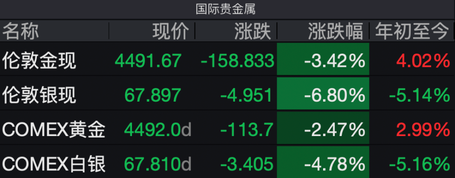 3月20日,国际贵金属期货也普遍收跌,COMEX黄金期货跌2.47%、报4492.00美元/盎司,本周累计下跌11.26%;COMEX白银期货跌4.78%报67.81美元/盎司,本周累计下涨16.64%。