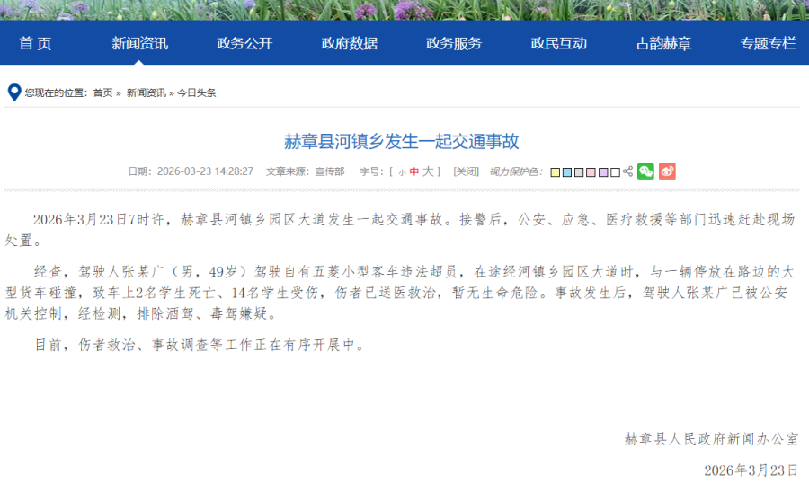 据贵州赫章县人民政府网发布通报,3月23日7时许,赫章县河镇乡园区大道发生一起交通事故。