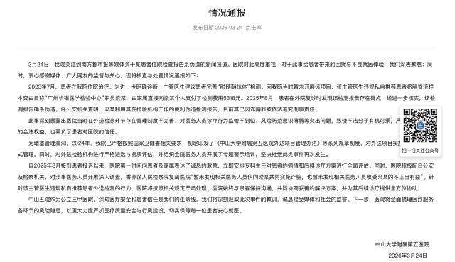针对患者住院检查报告被发现系伪造一事,3月24日,中山大学附属第五医院发布情况通报。