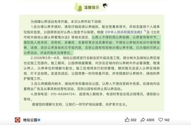 3月26日,北京地坛公园工作人员表示,今年不允许使用明星姓名进行认养登记,且往年已挂牌的“明星树”在续养时也必须配合修改。认养人须配合签署承诺书,并提供真实身份信息,不得利用认养标牌、认养宣传等环节,侵犯他人姓名权、名称权、肖像权、名誉权等合法民事权益。
