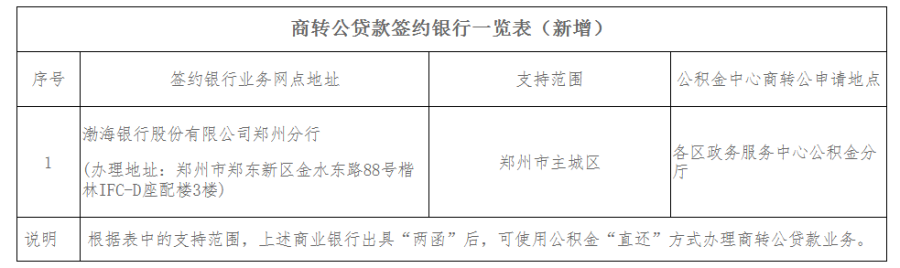 3月27日,郑州住房公积金管理中心发布通知,新增渤海银行股份有限公司郑州分行为“商转公贷款”直还方式签约银行,截至目前,郑州商转公贷款签约银行增至67家。