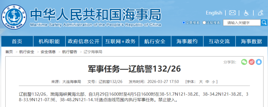 据中国海事局网站消息,大连海事局发布航行警告,3月29日16时至4月5日16时,渤海海峡黄海北部执行军事任务,禁止驶入。