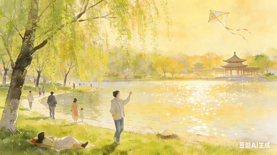 公园湖边,散步的人多起来。牵风筝的,铺垫子躺草坪的,还有啥也不干、就盯着水面发愣的。阳光碎在水上,一晃一晃的,像谁打翻了金箔。