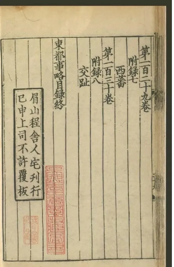 南宋时,四川眉山是当时三大雕版印刷中心之一,这里出现了我国迄今发现最早的、具有版权声明性质的出版物《东都事略》。该书目录后的牌记(版权标识)中,刻有“眉山程舍人宅刊行,已申上司,不许覆板”16字,明确表达了出版者已向官府备案,并禁止他人翻刻。
