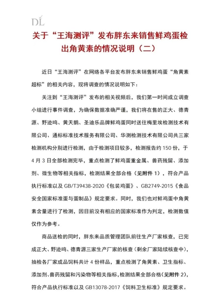 4月5日,胖东来官方账号发布关于“王海测评”发布胖东来销售鲜鸡蛋检出角黄素的情况说明(二):
