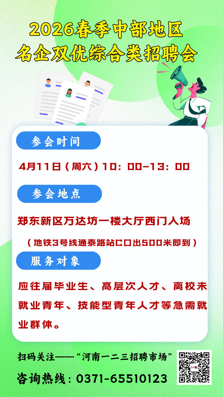 记者从郑东新区组织人事和社会保障局获悉,4月11日(周六)上午,郑东新区组织人事和社会保障局、祭城路街道办事处联合河南123人才网,将在郑东新区万达坊一楼大厅(西门入场)共同举办2026春季中部地区·名企双优综合类招聘会。