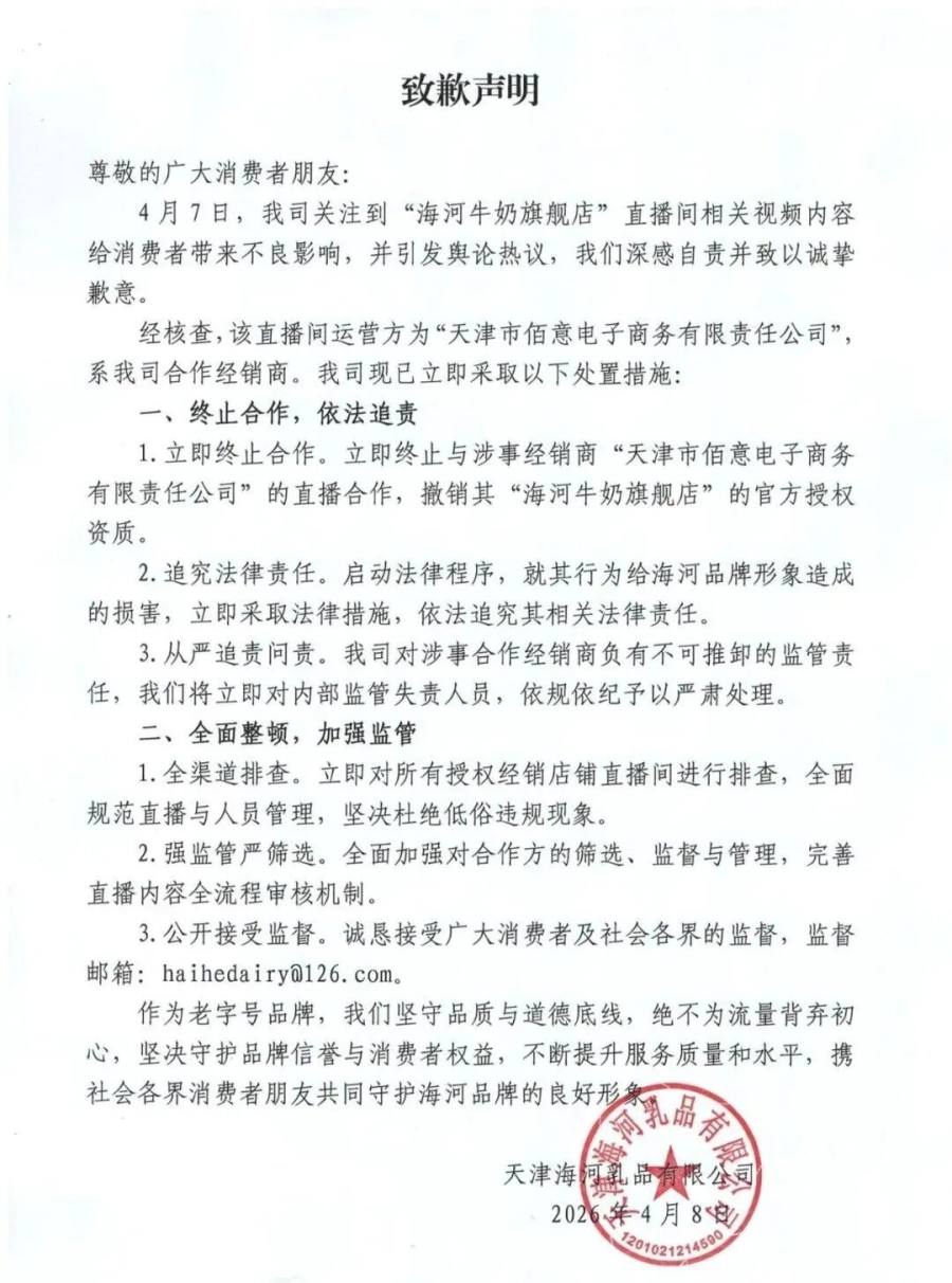 4月8日,针对直播间主播带货时言论低俗涉黄,天津海河乳品有限公司发布致歉声明称,公司关注到“海河牛奶旗舰店”直播间相关视频内容给消费者带来不良影响,并引发舆论热议,公司深感自责并致以诚挚歉意。