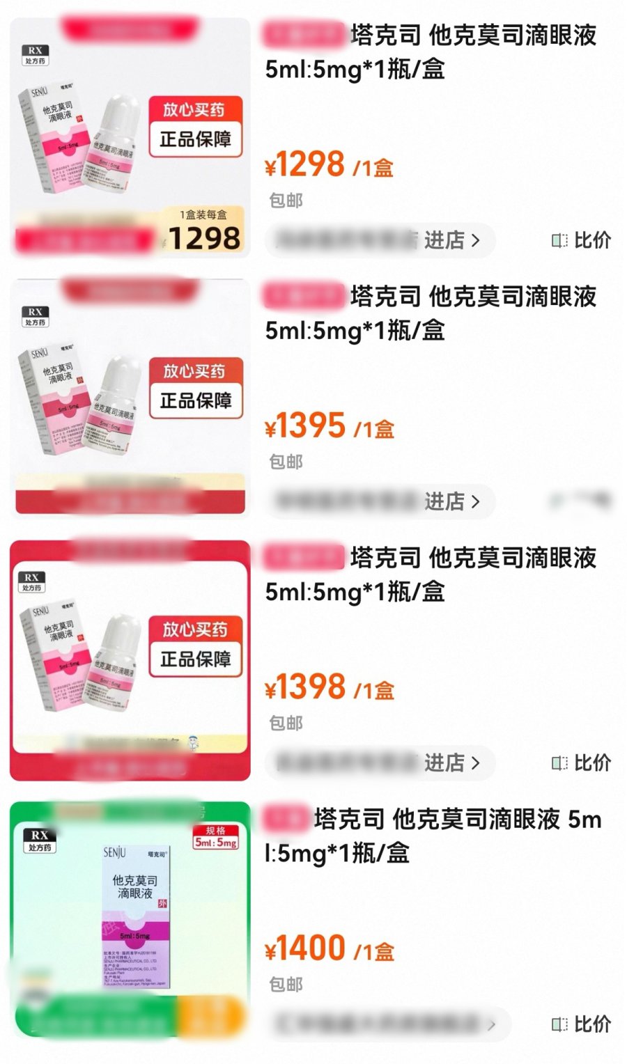 部分电商网站上他克莫司滴眼液的价格(截图自电商网站)