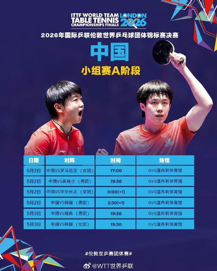 2026年世界乒乓球团体锦标赛于4月28日至5月10日在英国伦敦铜箱馆和温布利体育馆举行。北京时间4月28日凌晨,中国乒乓球队全员安全抵达伦敦,正式开启卫冕之旅。根据赛程安排,国乒男队将于当地时间5月2日首战英格兰队,国乒女队将于同日首战罗马尼亚队。