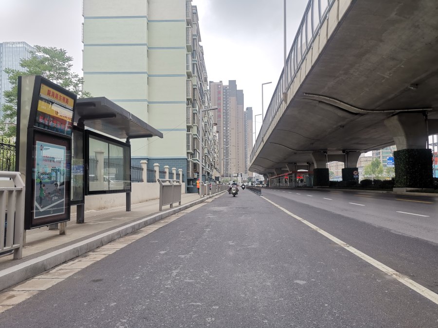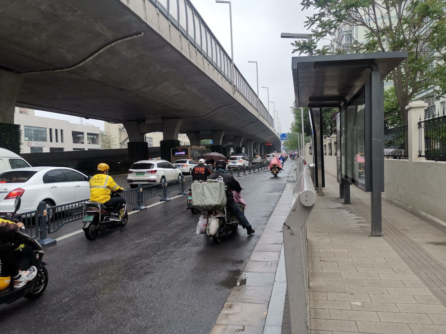 公交车驶离该站时,下车乘客也需在快车道“跨栏”后横穿非机动车道才能步行至人行道。眼前快速驶过的电动车流,让人不禁捏一把冷汗。