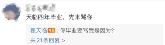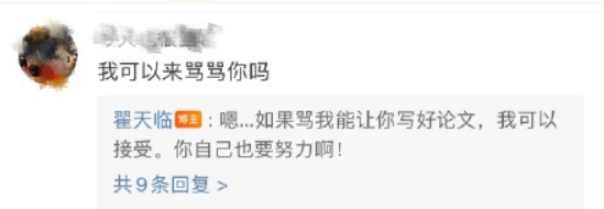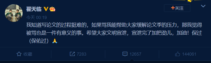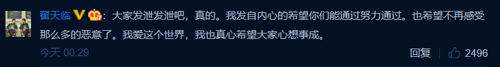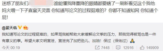 5月24日凌晨,翟天临发文回应网友留言,他表示:“我知道写论文的过程挺难的,如果骂我能帮助大家缓解论文季的压力,那我觉得被骂也是一件有意义的事。希望大家文明宣泄,宣泄完了加把劲儿,加油!保过(保佑过)。”