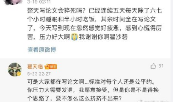 23日晚间,有网友在翟天临微博下留言,“翟天临,我论文查重又没过,你睡了吗?” 翟天临连续回复多位网友,鼓励大家加油写论文:“如果骂我能让你写好论文,我可以接受”、“我觉得我也承受了好多”、“关于知网这件事,改天好好聊聊,我也有委屈”。