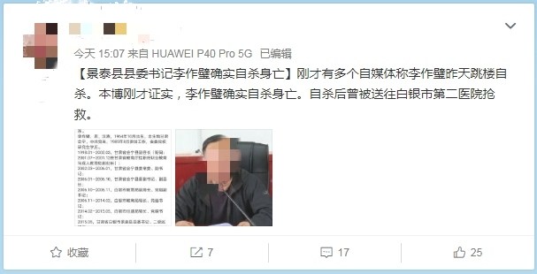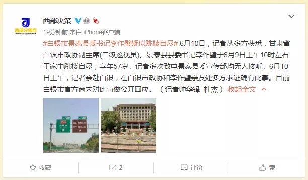 6月10日下午4点06分,西部大开发杂志官微 @西部决策 报道:6月10日,记者从多方获悉,甘肃省白银市政协副主席(二级巡视员)、景泰县县委书记李作璧于6月9日上午10时左右于家中跳楼自尽,享年57岁。记者多次致电景泰县委宣传部均无人接听。6月10日上午,记者亲赴白银,在白银市政协和李作璧亲友处多方求证确有此事。目前白银市官方尚未对此事做公开回应。