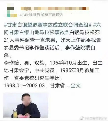 之前,有消息称,李作璧自杀与白银马拉松死亡21人事件有关。消息说,有关方面在与其谈话后,李作璧便跳楼自杀。