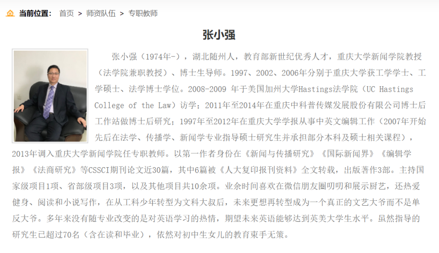 在其学院官网的教师介绍里,张小强的个人资料写着,“虽然指导的研究生已超过70名(含在读和毕业),依然对初中生女儿的教育束手无策。”