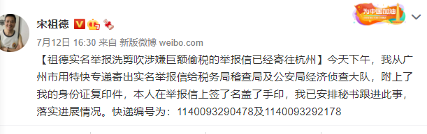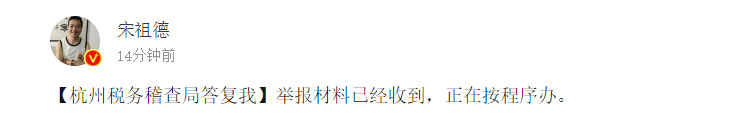 7月14日,宋祖德发布消息,称杭州税务稽查局答复他:举报材料已经收到,正在按程序办。