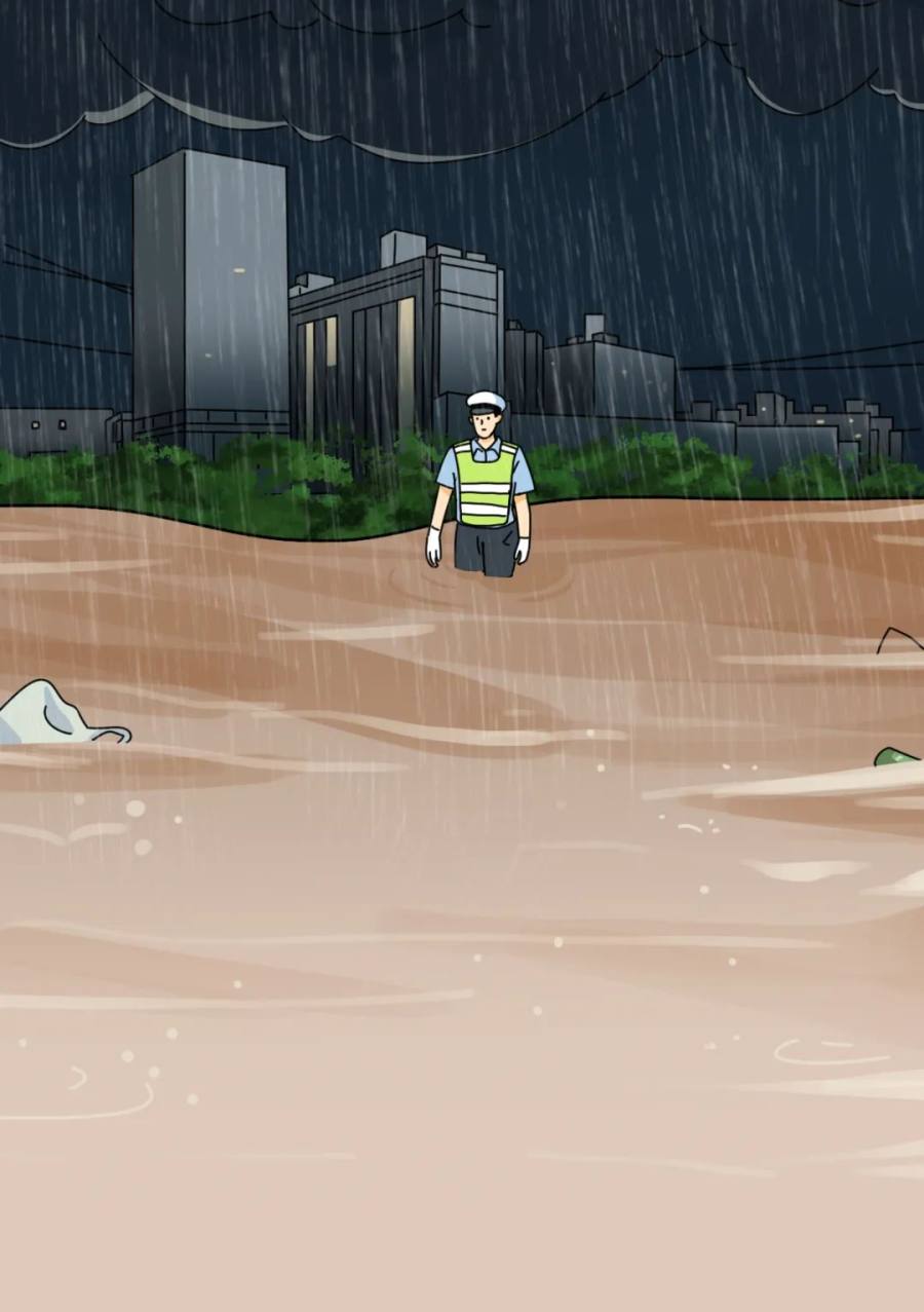 一位交警独自在水中摸索排水点排除险情
