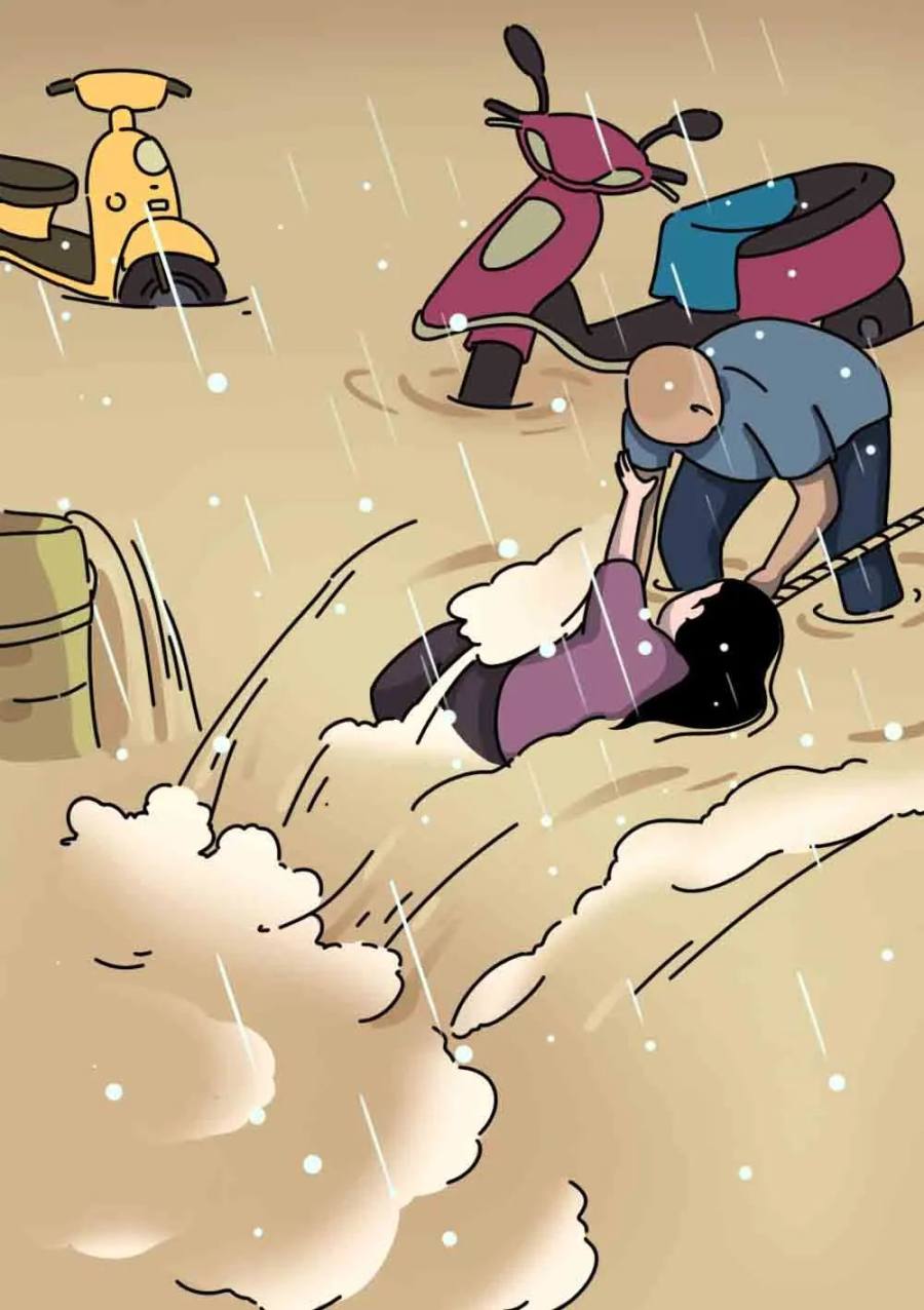 一名女子被冲进水坑
