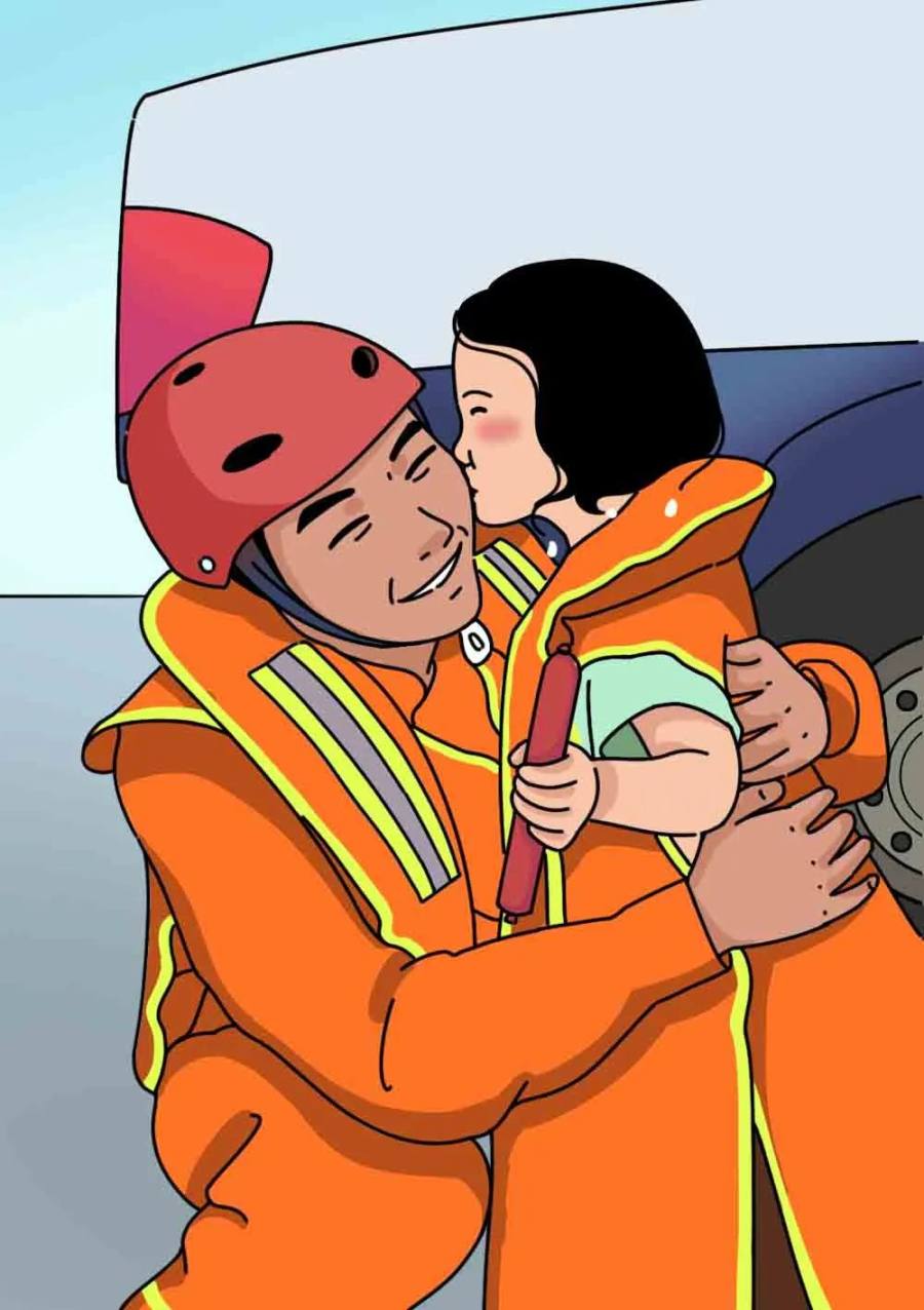 被获救的小姑娘献上一吻