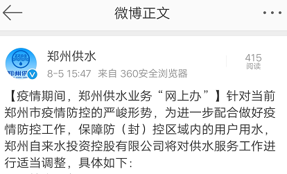 针对当前郑州市疫情防控的严峻形势,为进一步配合做好疫情防控工作,保障防(封)控区域内的用户用水,郑州自来水投资控股有限公司将对供水服务工作进行适当调整,具体如下: