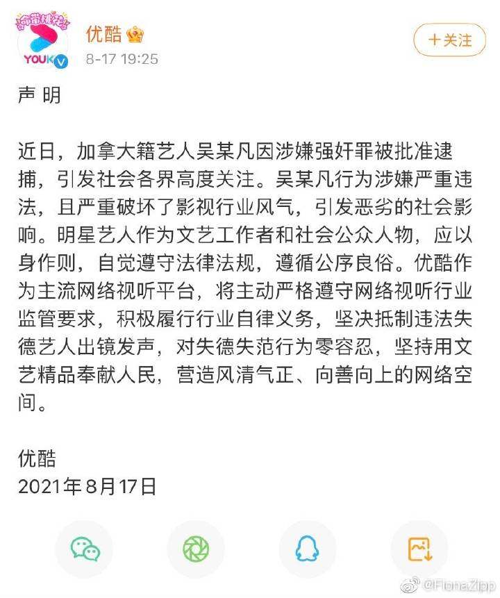 腾讯、优酷声明:已下架吴亦凡参演的影视综艺节目