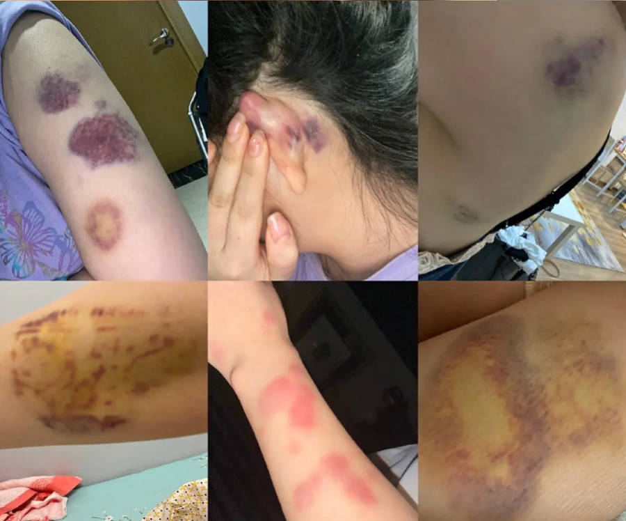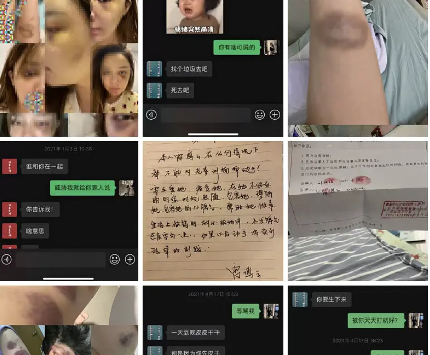 发帖女网友展示的照片中,可以看到脸部、手臂等处有多处淤青、伤痕,并展示了此前男方打伤自己后,公安机关开具的调解书。