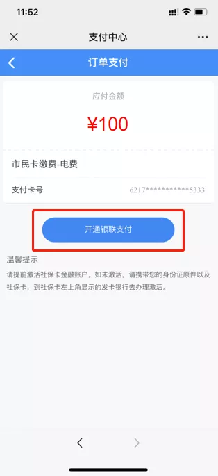 因您是首次在市民卡平台开通社保卡金融账户银联支付,开通完毕后需返回继续填写交易验证码完成支付,获取活动优惠。