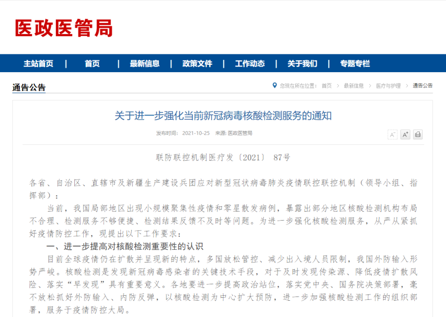 关于进一步强化当前新冠病毒核酸检测服务的通知,内容如下;