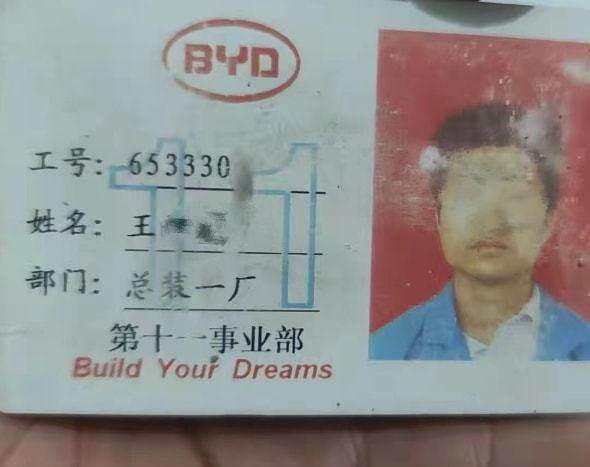 工牌显示,王江龙生前系比亚迪汽车有限公司第十一事业部员工,工号653330。王江龙去世后,他的亲属从手机中调取了工作打卡记录,从10月28日到11月3日,王江龙连续上了7个夜班,其中6个班工作时长在12小时左右。事发前一天的11月3日,王江龙早上8时05分下班,当天19时38分上班,至4日零时39分请假下班。王江龙的亲属告诉记者,警方推断王江龙的死亡时间为11月4号晚上19时到22时之间。