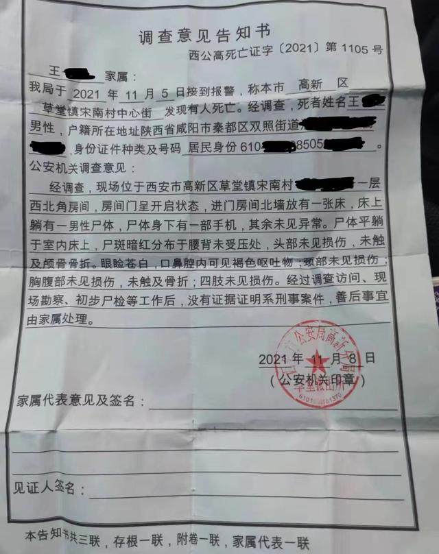 11月5日,36岁的王江龙(化名)被发现猝死在出租屋中,警方出具的调查意见告知书显示,已排除刑事案件。王江龙的家属向记者表示,他们认为王江龙的意外去世,和其生前曾连续超时高强度工作有关联。但因未做尸检,王江龙的具体死因目前尚不明朗。