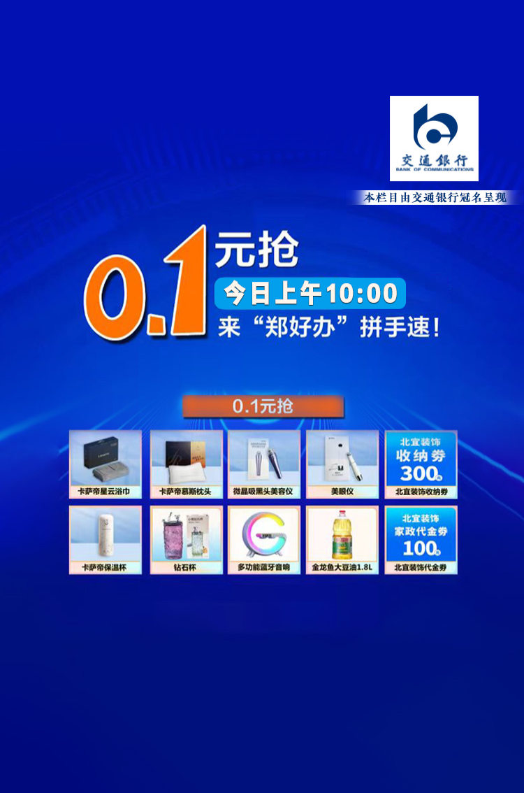 作为“醉美夜郑州”消费季的惠民活动之一,郑州报业集团联合郑好办,在9月6日、9月10日、9月13日开展“0.1元抢”活动。只需登录郑好办app,就可以参与抢购