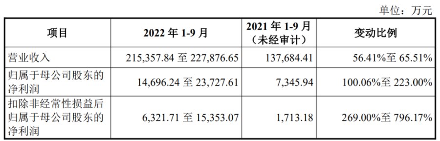 数据显示,2022年上半年,公司经营业绩增幅较大,财报显示预计2022年前9个月营收21.54亿元至22.79亿元,同比增长56.41%至65.51%;归母净利润为1.47亿元到2.37亿元,同比增长100.06%至223.00%;扣非后净利为6321.71万元至1.54亿元,同比增长269.00%至796.17%。