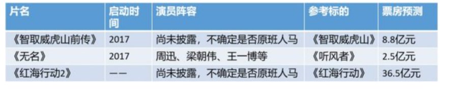 查看博纳影业的官网,2022~2023年博纳准备推向大荧幕的大制作为《智取威虎山前传》《红海行动2》和《无名》(《听风者2》)。其实这三部电影都是前期成功主旋律电影IP的续集电影。