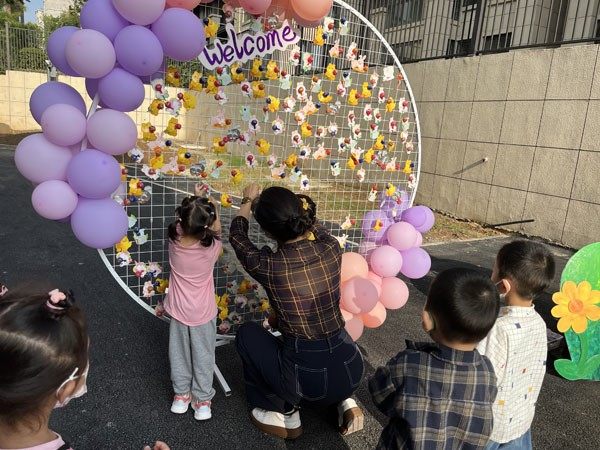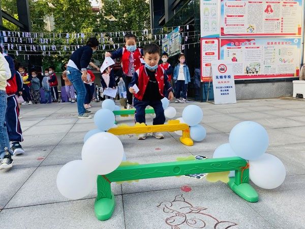 在爱民路园区幼儿园入门广场上,老师们亲手制作的精美欢迎展示牌陈列两侧,中间挂满了写有“聪明伶俐、健健康康、一鸣惊人......”等祝福贺卡,孩子们伸手够一够,双脚跳一跳,讨到了一个好彩头,愿孩子们都能被祝福萦绕,在未来的道路上摘取更高的“果实”!成长跨栏:百事可乐、平安喜乐、元气满满......,孩子们分别跨过了代表着美好寓意的跨栏,希望孩子们能够像“鲤鱼跃龙门”一样,逆流前进、奋发向上!一棒成名:一支支甜甜的棒棒糖,在最后一站等着孩子们,先苦后甜,新学期一起努力向未来!