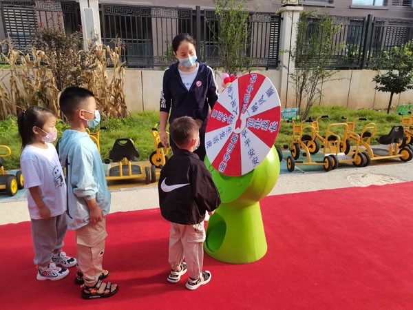在汉武路东园区幸运转盘处:孩子们转动转盘,身体健康、平平安安、吉祥如意……转盘上的每一句吉祥话都将开启孩子们的幸运之旅!击鼓鸣志:激昂奋进的鼓声伴随着稚嫩的童声,孩子们敲一敲,鼓声响起、一鸣惊人。成长跨栏:左脚清华,右脚北大,清华北大,统统拿下。孩子们跨栏进幼儿园,愿美好愿景都一一实现。梦想之门:每个孩子都有自己的梦想,有想当老师,有想当警察,有想当超人……今天梦想之门已为宝贝们开启,希望宝贝们走过梦想之门,都能够努力去实现自己的梦想!