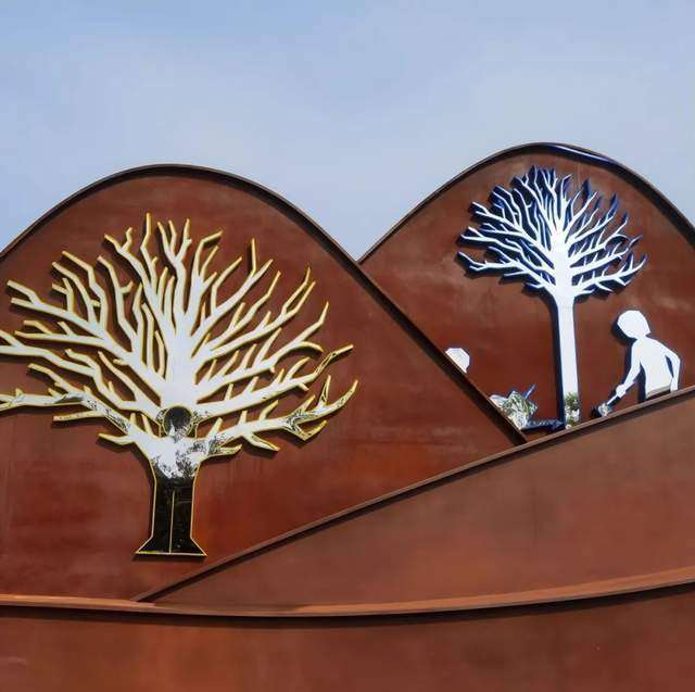《江山多娇》高3.8米,宽18米,由耐候钢、不锈钢、亚克力等材料建造,没有用任何材料涂刷表层,其所呈现出的视觉感受与现实环境中含铁量较高的土壤极为接近,让人感觉作品仿佛是从泥土中自然生长出来一样。正面的五座山峰紧紧相连,侧面的五道铁壁步步为营。山峰之上的每一棵树里都塑有一个伸展着四肢的人形,有些树的两旁还可见人们劳作的身影,树中有人,树在人在。作品造型简约、飘逸洒脱、质地素朴、气韵生动,体现出天人合一、道法自然的哲学思想。