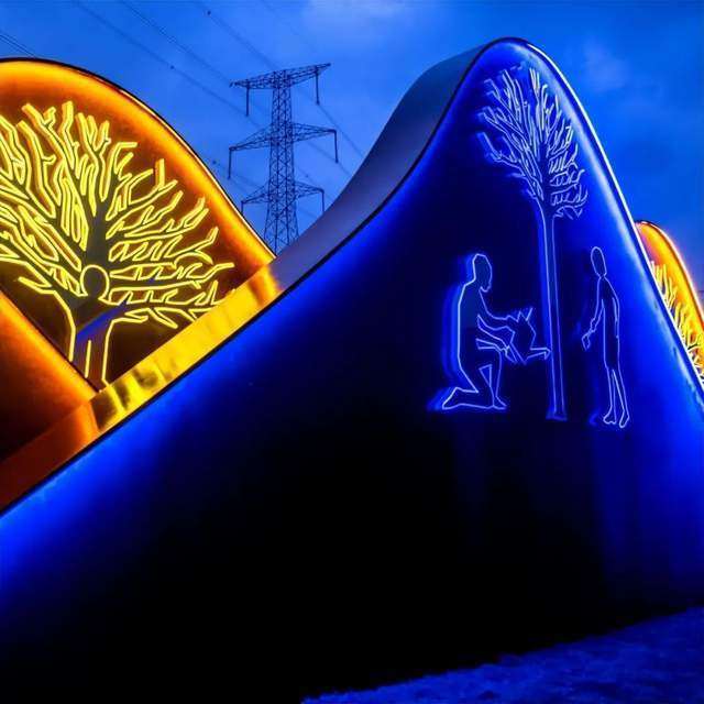 《江山多娇》在白天和夜晚呈现出截然不同的面貌:阳光下,作品气势恢宏、线条流畅,表现出“三山五岳”的壮美;夜色里,作品层次丰富,换个角度或灯光看树冠,便成为采用中国画“网巾法”绘成的水面,线条细密交织如同渔网平铺,尽显浪静风平之祥和。水面之上,蓝色的曲线就像一叶生命之舟正扬帆起航,“三山五岳”与“生命之舟”流光溢彩,交相辉映,更显润泽和美。中国文联副主席、中国摄影家协会主席李舸表示:“要在同一件作品里呈现出这两种不同状态,在艺术表现上是极其不易的。不仅需要作者具备深厚的艺术功底,还要深谙各种材料的物理属性和文化属性。”