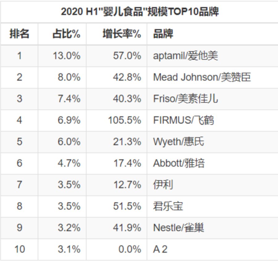 而飞鹤2019年的线上份额仅排在第六名,占比不到爱他美的一半。