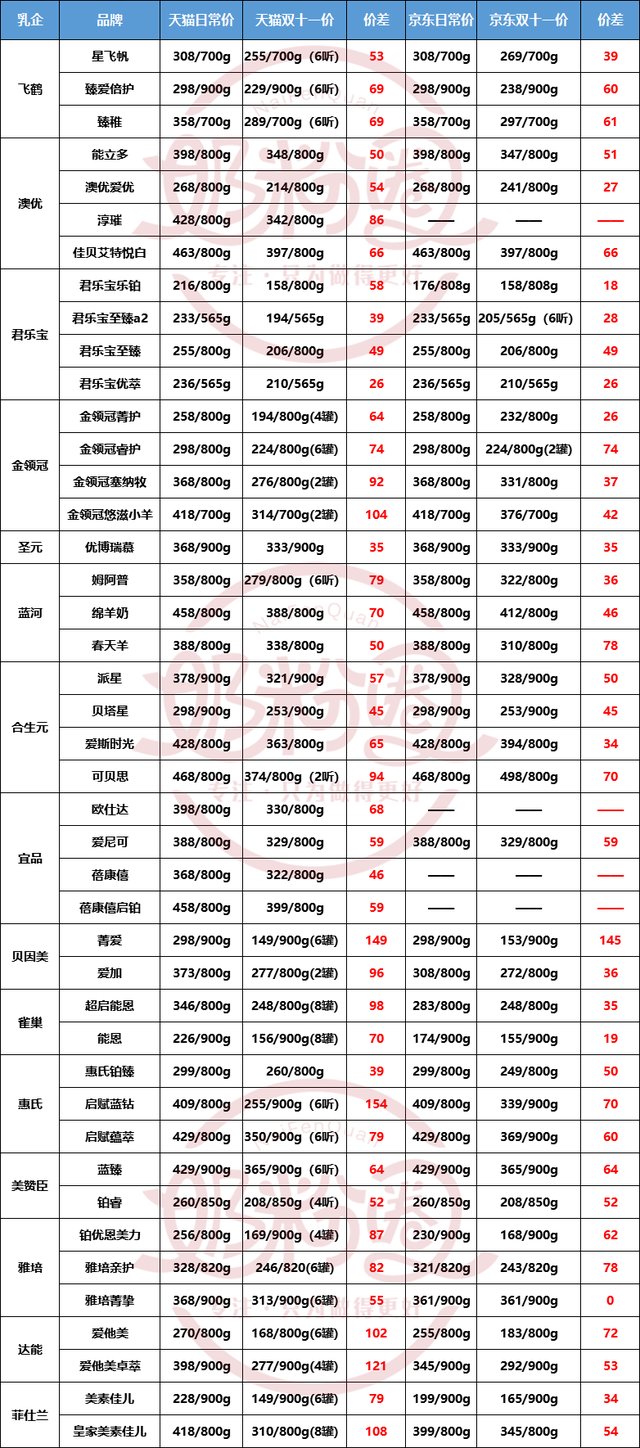 而从下面这张2020年双十一奶粉电商奶粉价格表中,我们可以窥见硬币的两面——因为外资奶粉企业在线下渠道维护方面花钱远少于国产奶粉,于是纷纷在线上砸钱,爱他美、惠氏启赋、美素佳儿等高端大单品折扣超过100元,单从打折力度来看远大于飞鹤星飞帆、君乐宝等在线下超级支棱的国产奶粉。