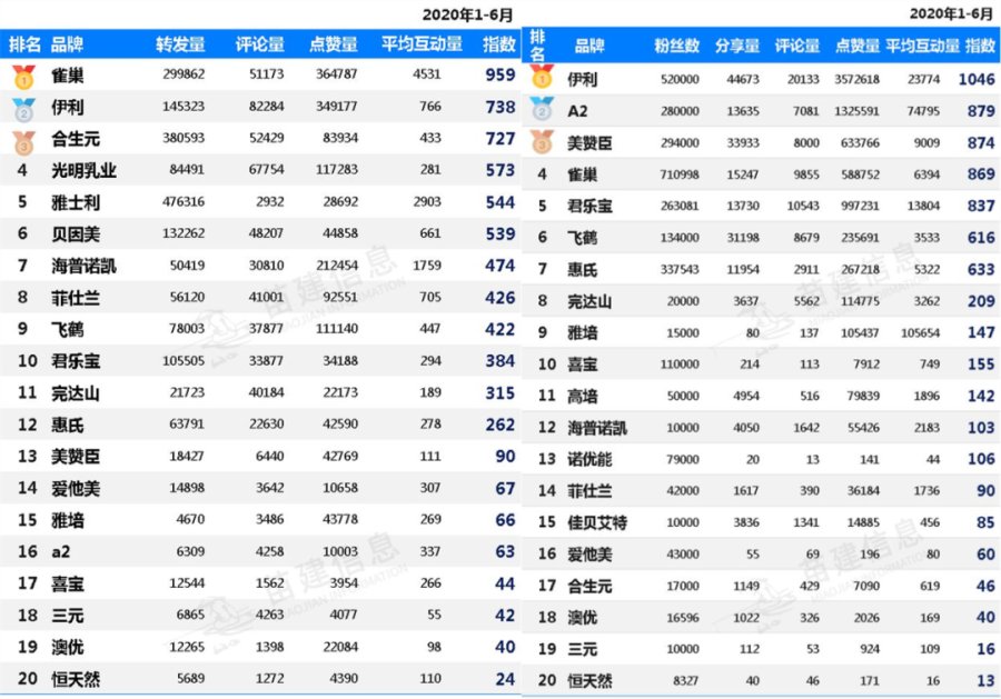 另根据苗建信息发布的2020上半年奶粉品牌《两微一抖官方账号传播影响力报告》,其中总榜前三名为雀巢、伊利和A2,可见飞鹤要想在线上各渠道中“逆风翻盘”,还有很长的路要走。