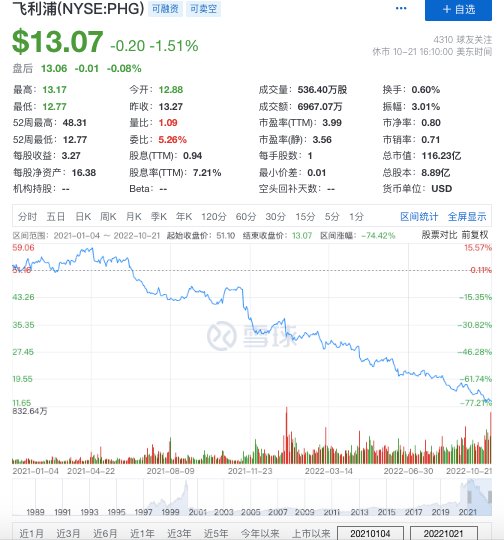 近一年来,在经历了供应链危机以及呼吸机召回事件后,飞利浦股价走势一路下行。截至美东时间10月21日收盘,其股价报收13.07美元,年内股价跌幅超七成,总市值116.23亿美元。