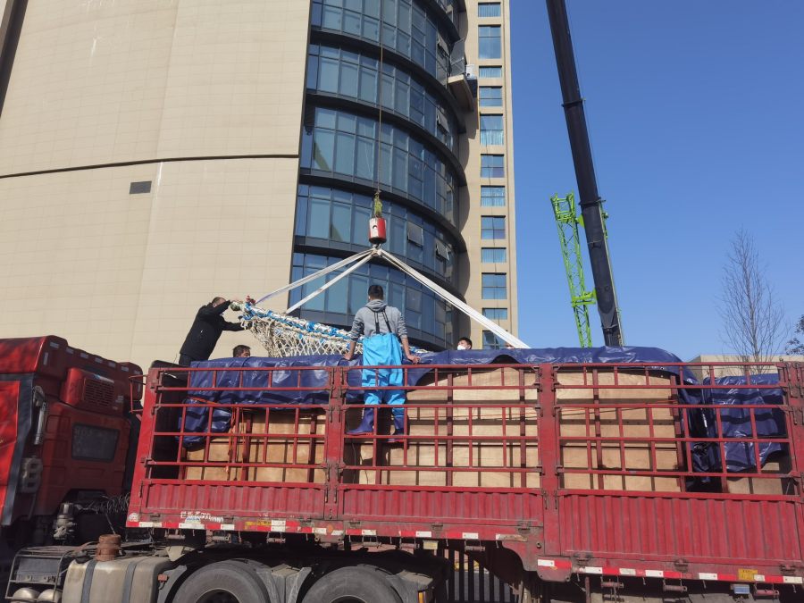 今天中午,在长途运输车抵达郑州海洋馆后,一辆承重50吨的起吊车紧随其后到达。搬运开始后,起吊车延展车臂提起装载白鲸的置物担架至6楼再水平旋转,现场所有人的视线都追随着缓缓移动的白鲸。经过认真准备,起吊车陆续将两头白鲸安全放至6楼白鲸湾墙体外侧的吊装平台。随后,20余名工作人员齐心合力将其安全平行移动至室内,两头白鲸得以安稳入驻。