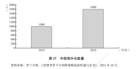 2019 年中国企业海外仓数量总计 1000 个左右, 而到了 2020 年已经增长了 80%, 达到了 1800 个。从这可以看出, 跨境电商海外市场竞争激烈。卖家为了做好本地服务, 将海外仓布局作为抢占市场份额的主要手段之一(见图 17)。