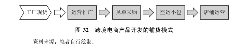 第二种:铺货模式。铺货模式是跨境电商最先开始、也最普遍使用的模式, 其突出特征为“卖照片”,即根据工厂的现货, 在海外电商平台上展示商品, 等到消费者下订单后, 卖家再去工厂采购, 一般为了保证时效性都采取空运小包方式配送 (见图 32)。这种 “守株待兔” 的销售模式需要 “守很多株” 才能收获 “一只兔”, 所以铺货型卖家的一个特征是注重使用 ERP 软件进行店铺运营, 以实现批量上架几千个、 几万个SKU, 等待消费者 “愿者上钩”。铺货型模式的优点是尽量不备货, 所以备货成本低;缺点是产品同质化竞争严重 (因为都是工厂现货)、 价格战激烈, 而且在价格战压力之下, 众多卖家不得不以次充好, 产品质量难以得到保证, 客户投诉率高。从产品角度而言, 这是一种 “短期主义”的运作方式。