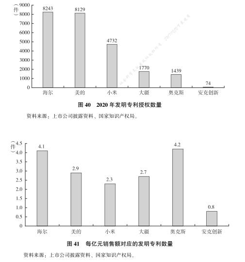 安克创新在跨境领域已经非常优秀, 但是横向对比中国其他品牌商, 发明专利的授权数量就显得非常少了, 不足海尔和美的的 1%。即使消除销售额的影响, 以每亿元对应的发明数量来看, 安克创新的指标也只有 0. 8 件,而几大著名品牌商的发明数量都在 2 件以上, 和安克创新比要高 2~5 倍,完全不属于同一个量级 (见图 40、 图 41)。由此可见, 对于众多跨境电商企业来说, 走重精品、 持续投入产品研发的道路并不容易。